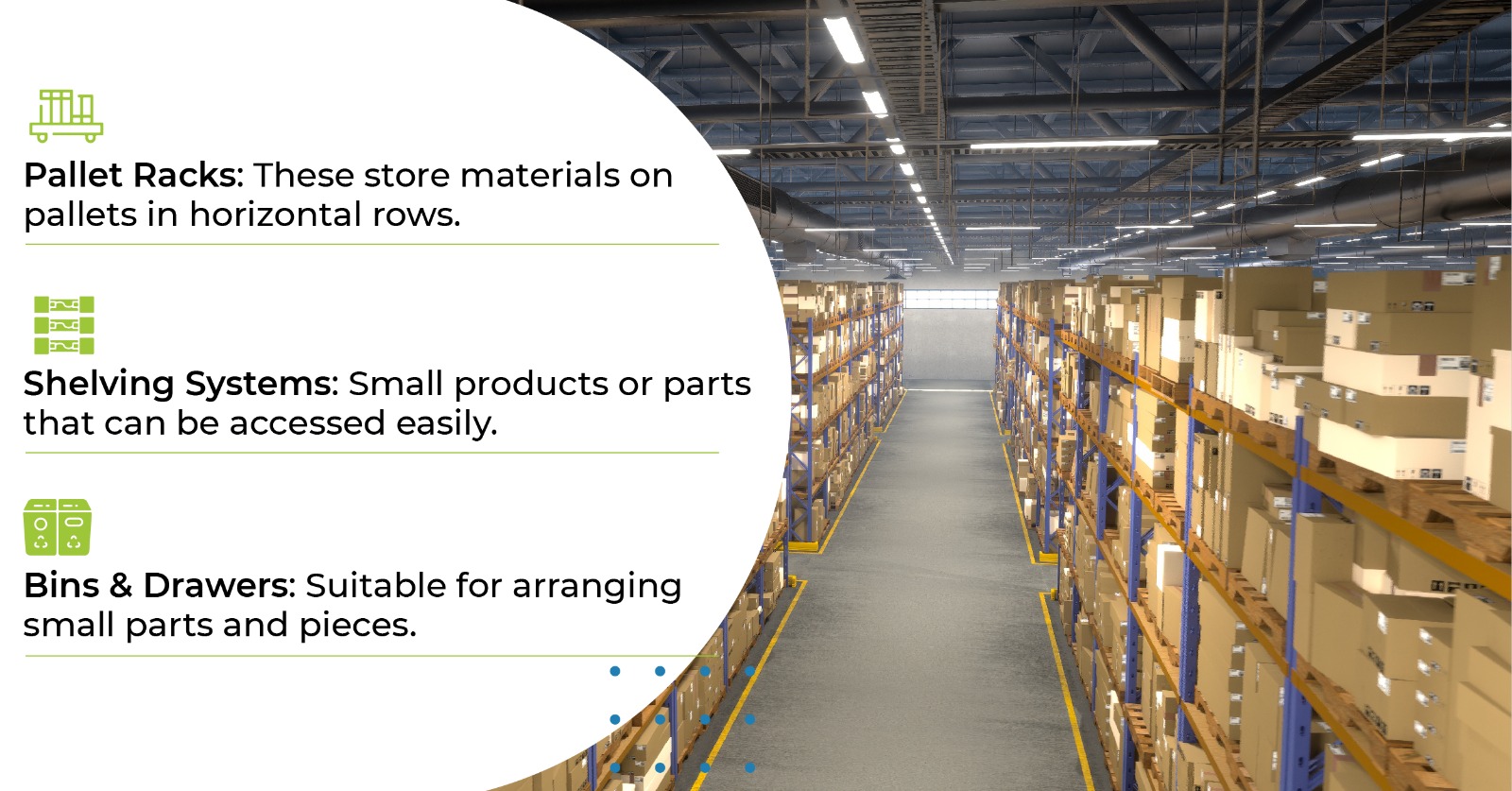 - Pallet Racks: These store materials on pallets in horizontal rows.