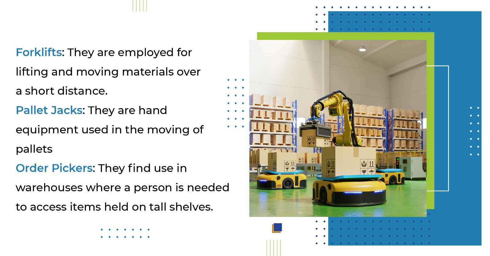 - Forklifts: They are employed for lifting and moving materials over a short distance.