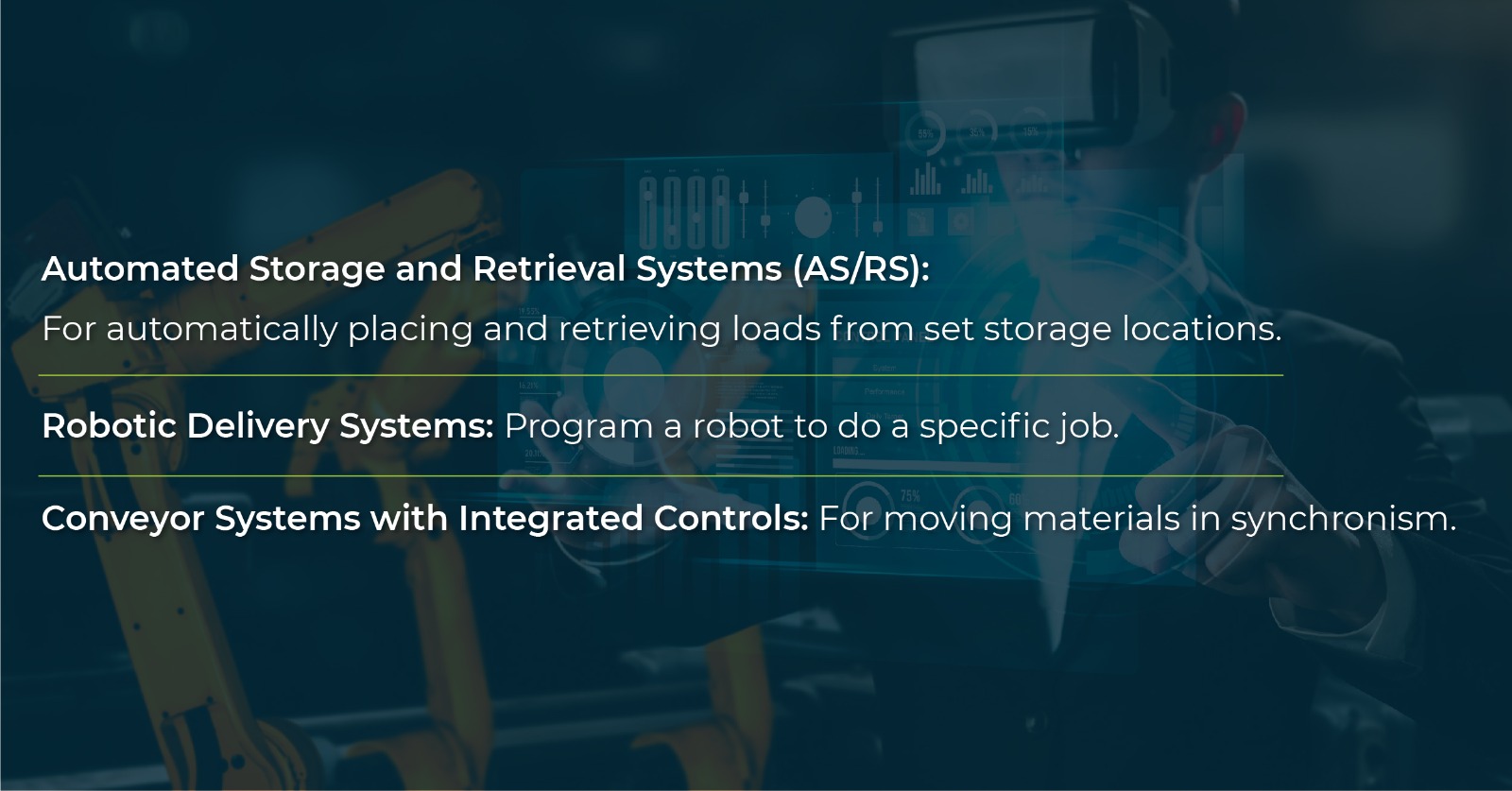 - Automated Storage and Retrieval Systems (AS/RS): For automatically placing and retrieving loads from set storage locations.